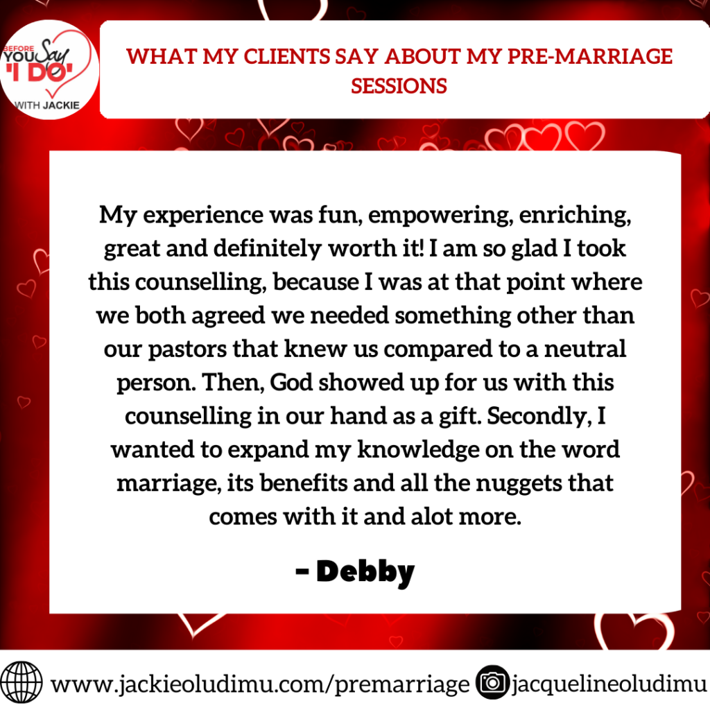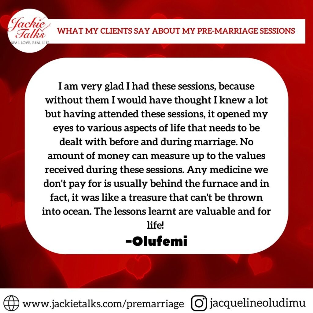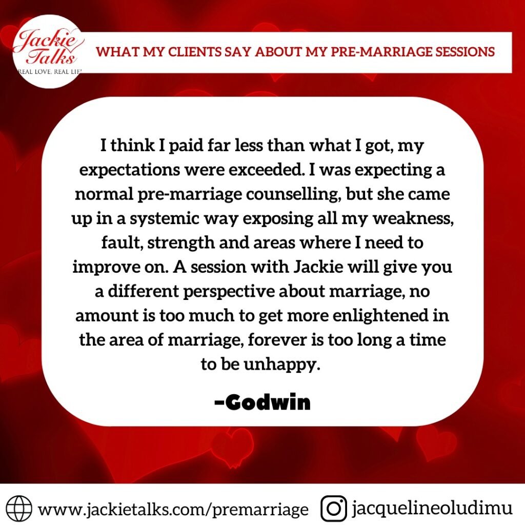 I want to say Kudos to Mrs Jacqueline for all she does. The pre-marriage sessions were eye opening, interactive, excellent and enlightening. It uncovered so many things we may not have talked about before our wedding and prepared us for the journey ahead. The value we got would last for life, it was worth it and much more. I would like to tell every engaged couple not to go ahead into marriage without having such a robust and knowledge filled preparatory session with a Christian Coach and marriage counselor like Jackie Talks.