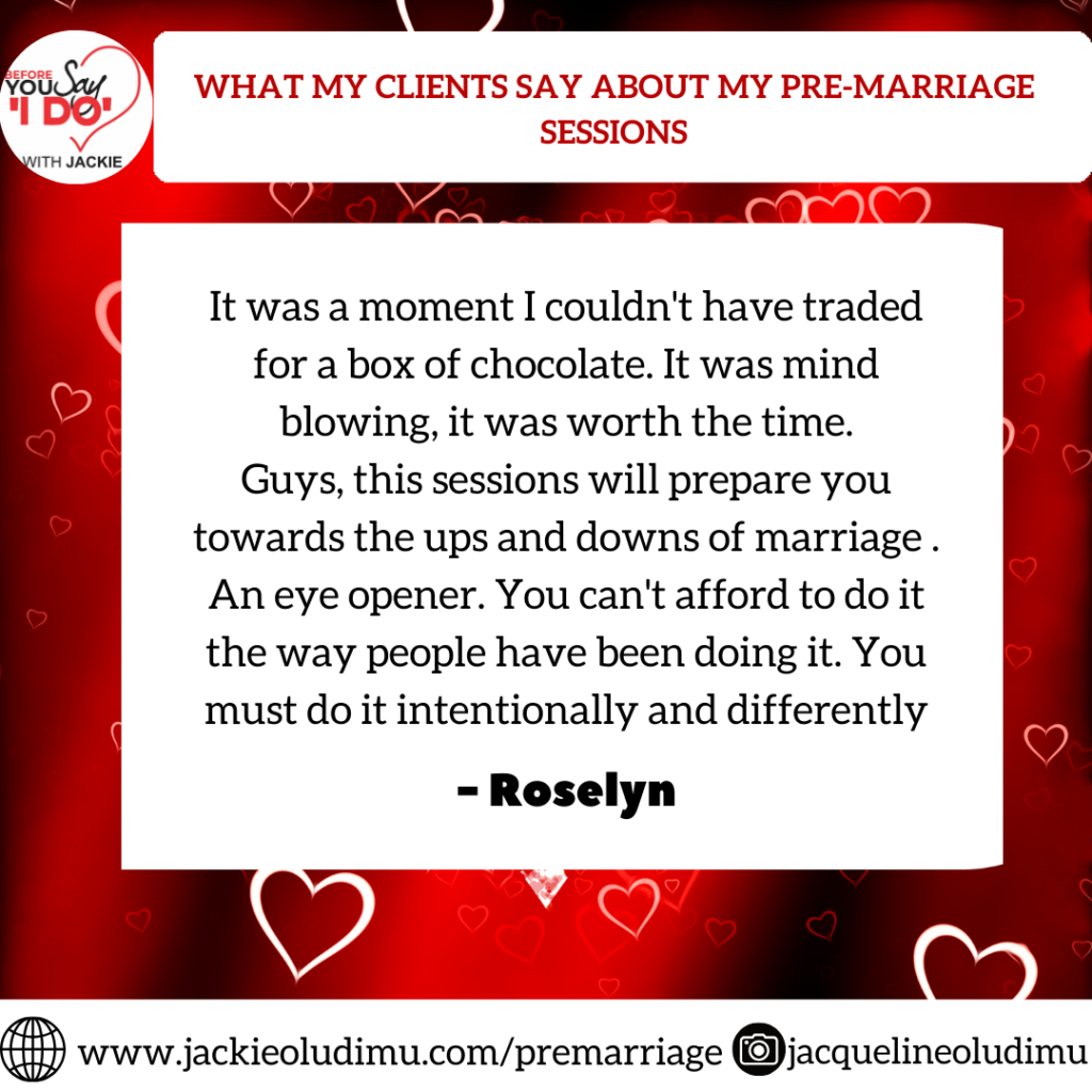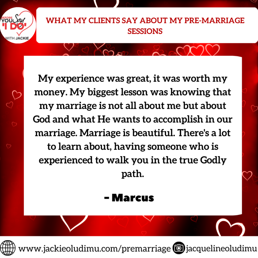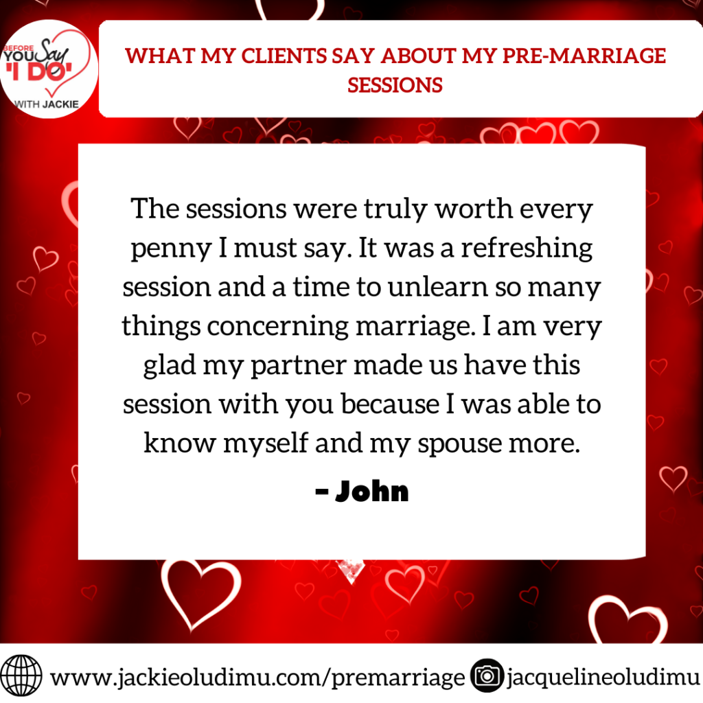 I want to say Kudos to Mrs Jacqueline for all she does. The pre-marriage sessions were eye opening, interactive, excellent and enlightening. It uncovered so many things we may not have talked about before our wedding and prepared us for the journey ahead. The value we got would last for life, it was worth it and much more. I would like to tell every engaged couple not to go ahead into marriage without having such a robust and knowledge filled preparatory session with a Christian Coach and marriage counselor like Jackie Talks.